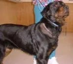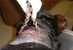 A collar has a much different meaning for a brown eyed boy who won the hearts of the Bremerton Animal Control staff and the volunteers of R.E.D.. The call came in. A dog was dumped in the park and a confusing message about a chain. BAC's, Officer Olson, headed to the scene. What she found was a scared, sick, frightened Rottweiler. She instantly knew what was wrong and was fill with the rage. This beautiful 18 month old boy had a large chain completely embedded into his neck. His neglectful sub-human owner had placed it there probably a year ago. As this dog grew, the collar was never changed. His neck slowly, painfully swallowed the heavy chain. The thought of the daily pain from the chain and the infection this dog had indured makes me sick and angry. In the last year, they could not find the time to help their innocent charge from this collar. Which almost took his young life. Rather than take care of the abuse and neglect they inflicted upon him, they simply dumped him in the park. The whys will probably never be answered.